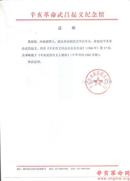 辛亥首义革命老人鲁祖轸,河南新野县人,生于1894年,80年逝世,于1909年(当时十六岁)投笔从戎,入湖北陆军第八镇十五协、三十标三营后队二棚当兵,宣统三年二月由王宪章、彭纪麟介绍加入革命秘密组织——文学社,共同研究军事和文学,是文学社社员。在此期间,痛感列强和清朝政府的腐败,立志救国救民。