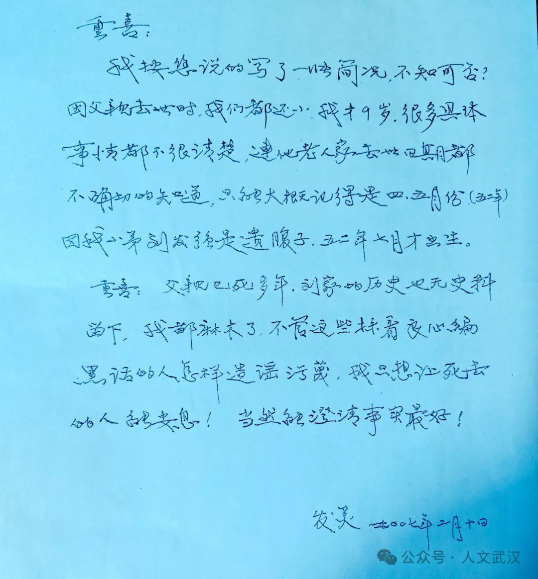 说到1956年的谈话记录,事实上,刘同已于1952年在重庆去世,绝不会有1956年贺觉非与刘同的谈话纪录。就此,刘重喜于2007年致信给冯天瑜教授。冯教授当即回信,其主要内容是:“贺老与我合作撰写《辛亥武昌首义史》时,只提供以前所写草稿,而贺老字迹甚草,难以辨认。他于1985年底辞世后,无法核实他早年采访辛亥老人的笔记,这使得《辛亥武昌首义史》中留有少数不确文字。以后若有修订、再版该书机会,一定将其改正。如无法核实之处,则加删削。”2011年,冯天瑜、张笃勤合著的《辛亥首义史》(湖北人民出版社出版),将不实误传及注释删除。