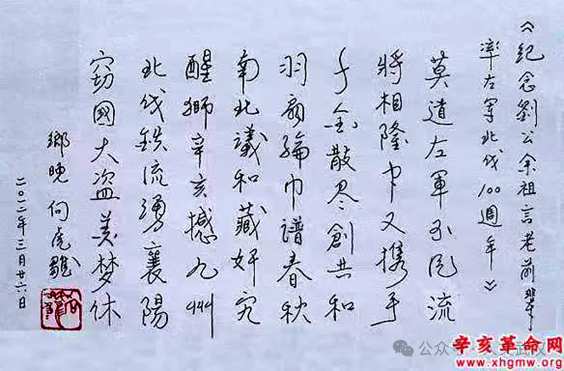 自由发言环节,辛亥革命志士熊秉坤之孙熊永铸、向岩之孙向虎雏、刘裕海之孙刘谦定等均作以祖辈、父辈的口述历史作补充发言。向虎雏教授且高声朗诵其以《纪念刘公、余祖言老前辈率左军北伐100周年》为题的一首诗: