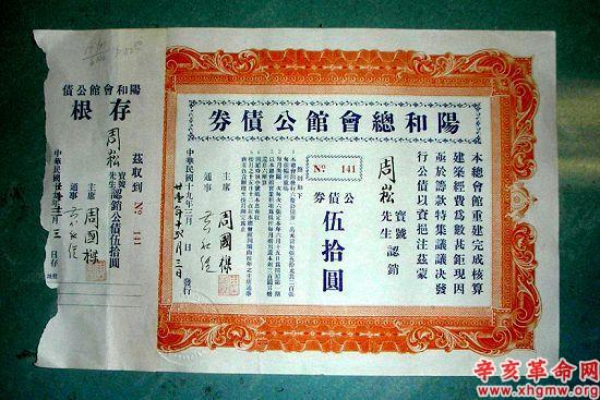 周崧先生购买阳和总会馆伍拾美元公债卷。(黎志滔提供)