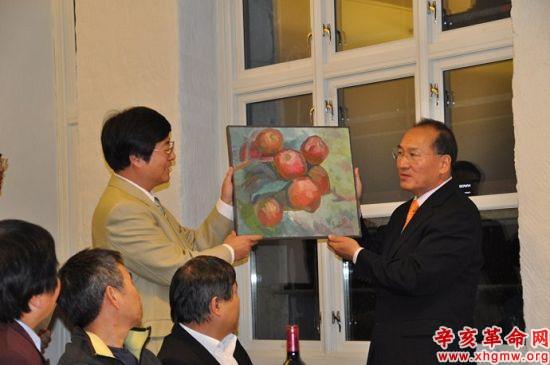 演讲结束后,为了感谢赵大使出席联欢会和出任驻挪大使数月以来对挪威侨界、华商会的关心,曹会长向赵大使赠送了由华商会副会长 - 挪威著名华人画家、摄影家、作家林凤仙副教授专门绘作的一幅以苹果为主题,名为“ 硕果累累”的油画。它象征着数月里赵大使工作硕果累累;并祝赵大使平平安安,身体健康。