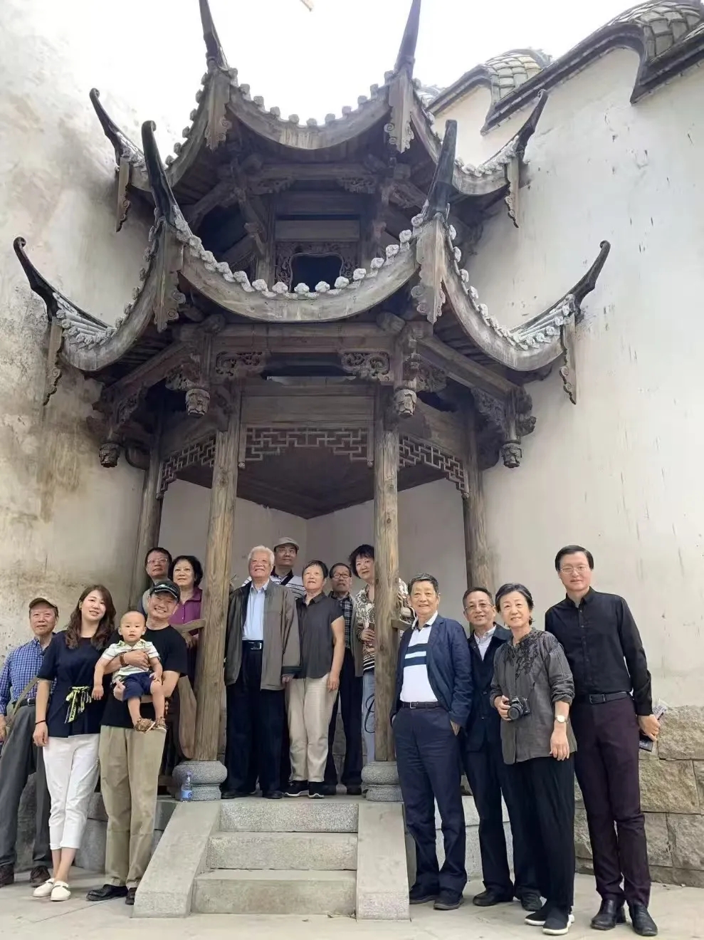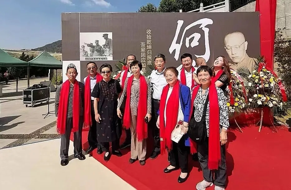 何家第二代何达,何敏,第三代何梦妮,何迪,何代宁,何美妮,何巍,何卫宁伉俪,第四代何煜及近亲在纪念亭合影