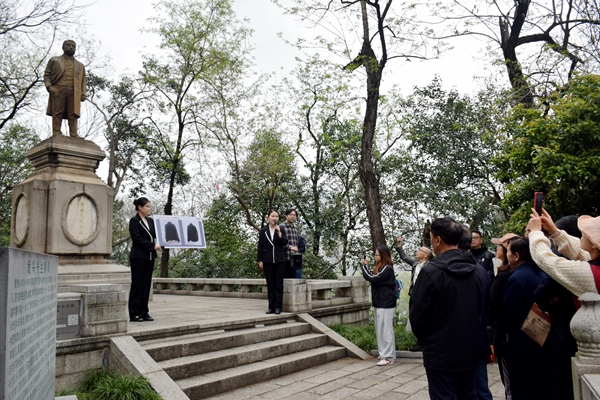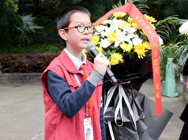 郑钰彬同学致辞(摄影:何蒙) 黄鹤楼诗词讲解(文物和非遗保护)志愿者代表郑钰彬同学深情献辞,抒发对革命先烈的缅怀之情与对首义文化的守护之心,道出了青少年一代对英烈的敬仰与对文化传承的担当。随后,全体参与人员手持鲜花,逆时针绕纪念碑一周,将鲜花轻轻放在碑前,每一束鲜花都寄托着对英烈的哀思,每一次驻足都凝聚着对精神的传承。活动结束后,“武昌首义第一枪”熊秉坤之孙熊永铸、辛亥革命志士蔡济民之孙蔡礼鸿先生,接受了专访。部分参与者还自行参观了抱冰堂,继续追寻首义印记。