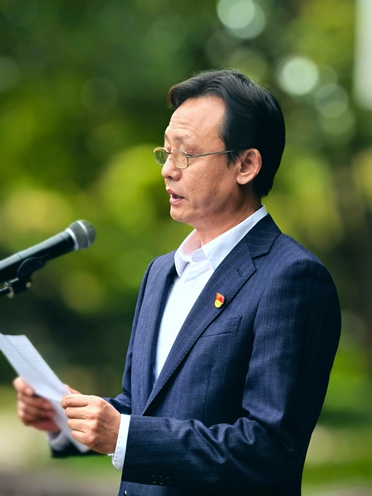 王飞先生致辞(摄影:刘建林) 武汉市黄鹤楼公园管理处主任王飞表示,我们一同缅怀先烈,通过红色的研学主题宣讲等活动,让更多人了解先辈的英雄事迹。我们要铭记历史,传承文脉,把首义精神牢牢扎根在这片土地上,融入武汉城市发展的血脉,为建设新时代英雄城市谱写武汉高质量发展新篇章贡献我们的力量。