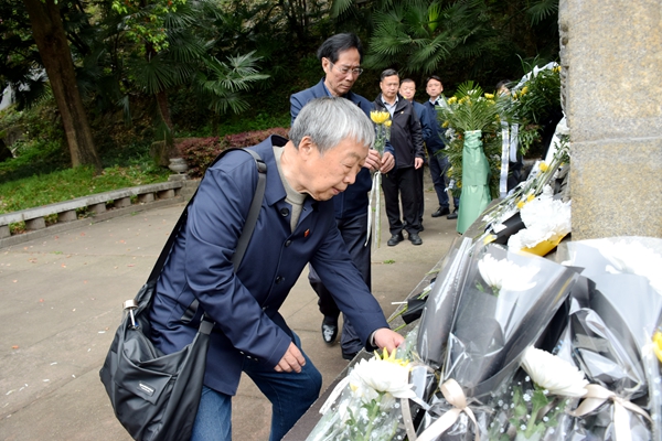 祭扫仪式现场(摄影:昌庆旭) 上午11时10分,庄重的祭扫仪式在辛亥革命武昌首义纪念碑前举行。各参加单位代表依次敬献花篮。