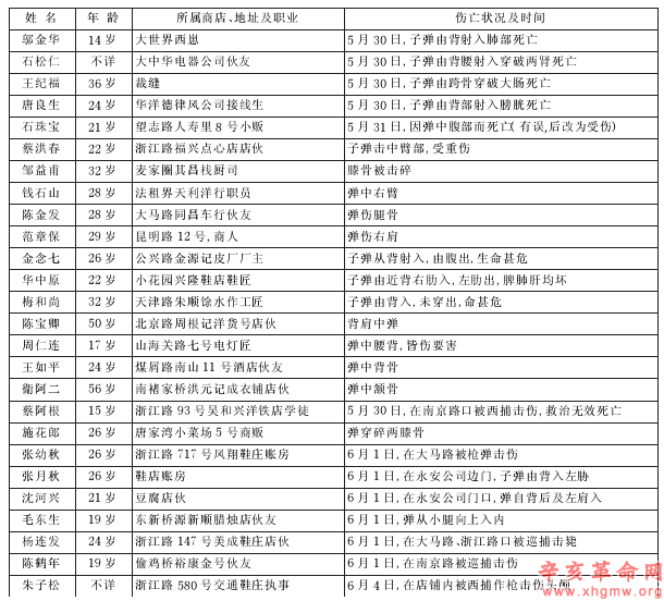 的确,自5月30日至6月初,马路商人不仅目睹了惨案发生的全过程,而且有很多无辜的小商人及店员在惨案中不幸中枪伤亡,表1所列伤亡的部分商界人士是据《申报》的不完全记载加以整理的。作为公共租界中街区性的商人团体,商总联会和各路商联会有责任代表会员对租界当局的惨无人道的暴行积极予以抗争。