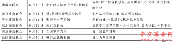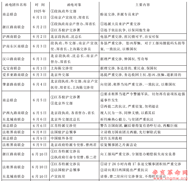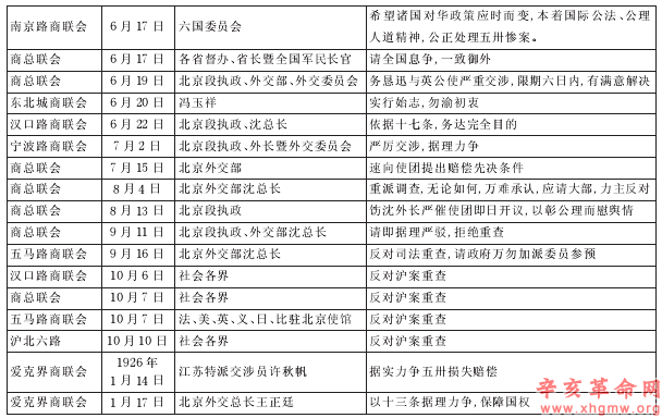 五卅惨案的发生,激起了中国人民的一致愤怒,各界纷纷致电致函中央及地方政府,表达政治诉求,敦促政府迅速展开交涉。商总联会及各路商联会加入到这一函电洪流中,先后数十次发出函电,或致段祺瑞政府、外交部、江苏省政府及江苏省驻沪交涉署,或通电全国各界,或致电六国委员会。在表达悲愤的同时,提出了商界处理五卅惨案的要求。表2是根据《申报》记载整理的商总联会及各路商联会部分函电内容。
