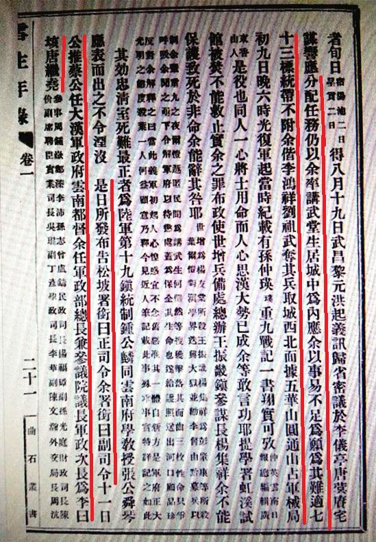 李根源撰《雪生年录》记载重九起义前后开会战斗及建政情况:“分配任务仍以余率讲武堂生居城中为内应,余以事易,不足为,愿为其难适七十三标统带不附,余偕李鸿祥、刘祖武,夺其兵,攻城西北面,据五华山圆通山,占军械局……是日所发布告,松坡署衔曰正司令,余副署衔曰副司令。十一日公推蔡公任大汉军政府云南都督,余任军政部总长兼参议院议长,军政部次长为李曰垓唐继尧”【注:李根源《雪生年录》,1929年排印本第21页】。