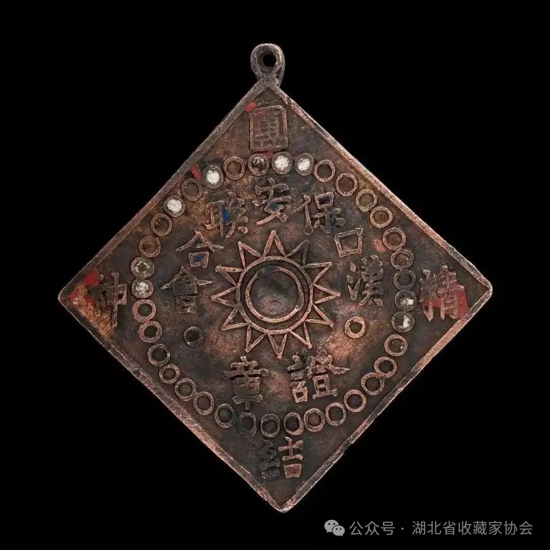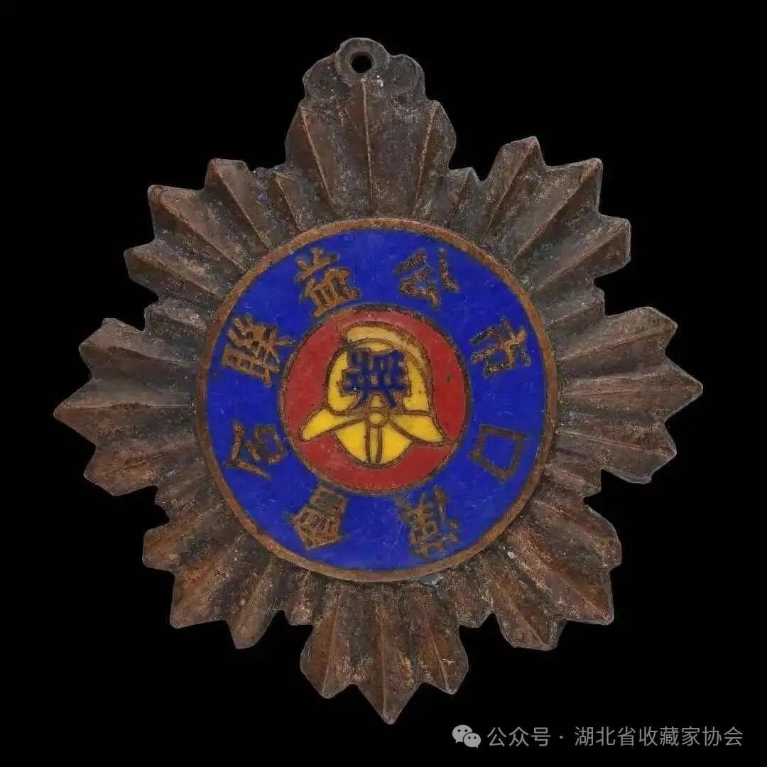 至宣统三年(1911年)三月初十日,由汉口各商团发起,各保安会联合成立了汉口各商团保安联合会,作为研究消防、联络感情之总机关。其任务是“有备无患,以防万一”。同时,各分会联合出资购买地皮,建筑会址,在汉口长堤街中段(安徽会馆侧边)。公推回民教火会会长马刚侯为第一任联合会会长。各会义务消防员的服装及防火帽等,由各会自制,不要求统一式样。 在辛亥阳夏保卫战中,清军火攻汉口,各保安会联合会会员荷枪救火,多有中弹身亡,成为辛亥革命中最早牺牲的消防义士。 辛亥武昌首义后,为了表彰三位义务消防员见义勇为、忘我献身的精神,全市各会联合召开追悼大会,在全市游行以示敬意。并决定每年清明节全市义务消防员在全市游行一次,派代表到汉阳为三勇士扫墓。民国五年(1916年),大总统特颁“救灾捍患”匾额一方及“董说舒和惟好善,班言仁爱始能群”对联一幅,以资奖励。 民国初年,保安联合会发展到48个分会,拥有“汽龙”24辆。1929年,保安联合会改会长制为委员制,更名为保安公益会,将48个分会调整为39个分会。总会设委员会,下设十股,每股置主任一人,由委员兼任。消防股主任兼任消防队队长。每分会设消防组,置组长一人,兼任消防分队长,下设支队长二人,组员二十人,教练官若干人。 这枚汉口保安联合会永济消防会证章见证的正是这段历史!(图二)