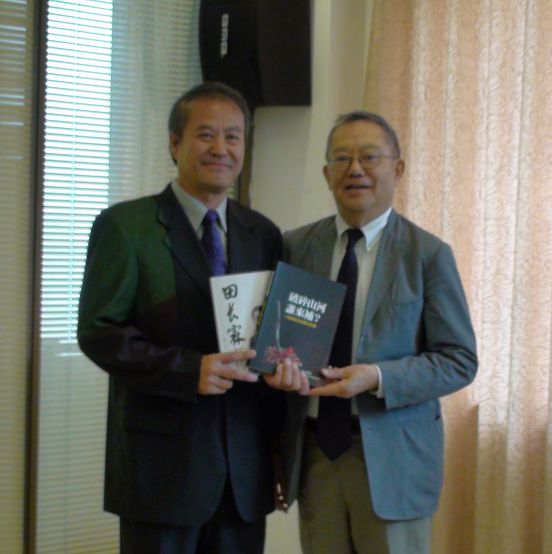 田长焯先生(右)向武汉抗战纪念馆赠送书籍(摄影:何蒙)